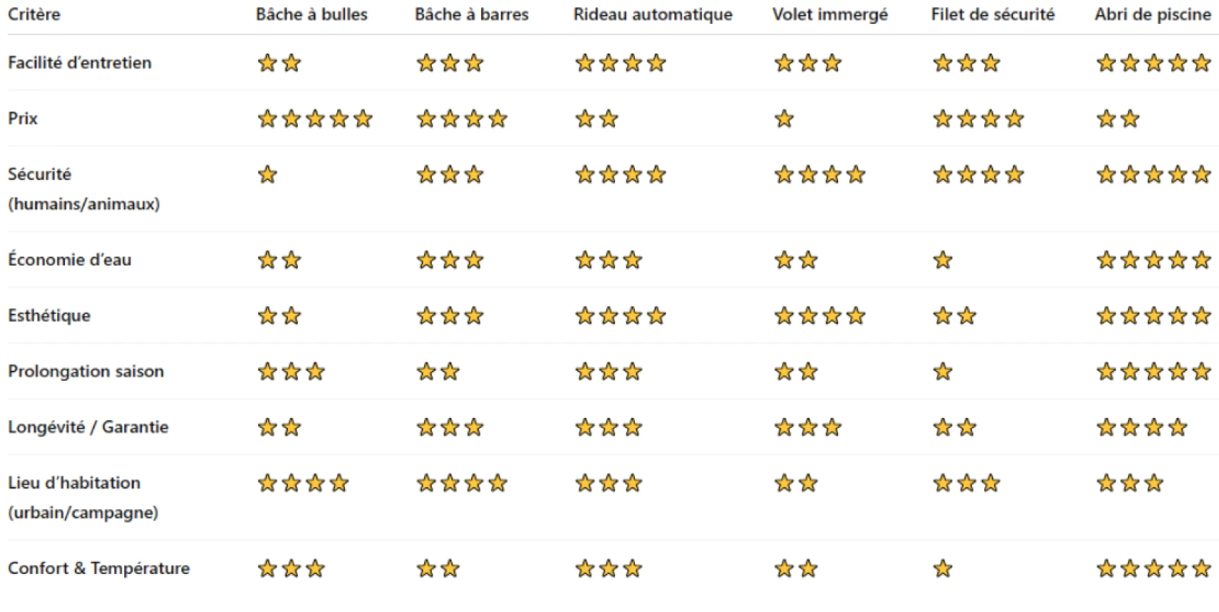 Récapitulatif comparatif des solutions pour couvrir une piscine