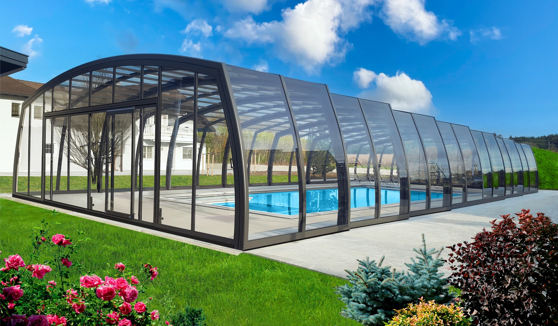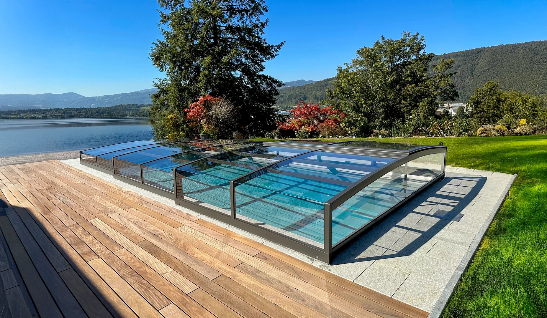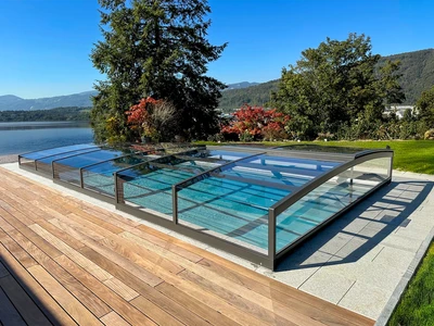 Grâce à l’effet de serre naturel, l’abri augmente sensiblement la température de l’eau de 4 à 10 degrés en moyenne, sans consommation énergétique supplémentaire telle qu’une pompe à chaleur. Le bassin est protégé des intempéries, du vent et des salissures en toute saison, ce qui réduit considérablement les besoins d’entretien et l’utilisation de produits de traitement dans votre eau.